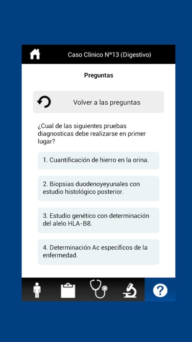 El usuario podrá revisar todos los aparatados de cada caso (síntomas, anamnesis, exploración física y pruebas complementarias) y al final podrá responder a una batería de preguntas sobre el caso clínico.