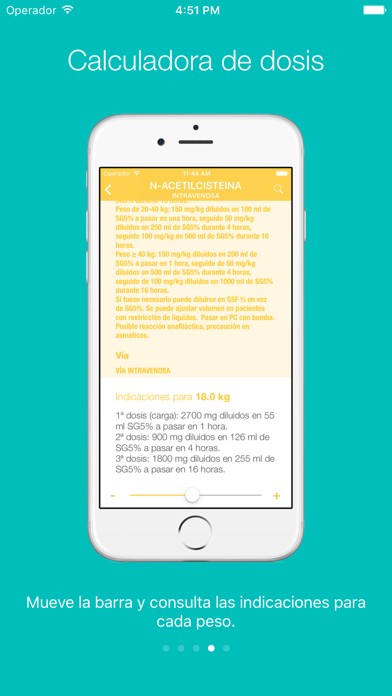 Pulsa la ficha del fármaco que quieras consultar y aparecerá la barra de pesos. Mueve la barra y busca el peso de tu paciente. DosisPedia te sugiere la dosis para ese peso. Además podrás consultar las indicaciones generales del fármaco: vía de administración, posología y presentación.