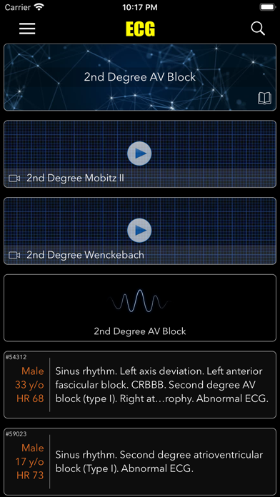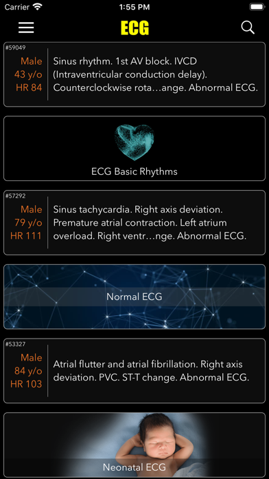 1) Browse ECG cases by findings like «Atrial Flutter», «Escape Rhythm» and more
