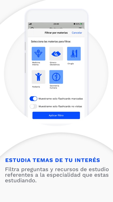 Podrás crear exámenes completamente personalizados, filtrando preguntas por idioma, sin contestar, incorrectas, marcadas, por materia y submateria.