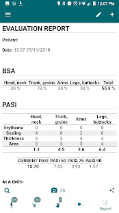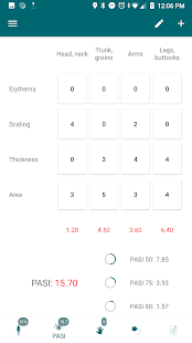 * PASI: This is a classic scale assessment of the severity of psoriasis developed in 1978. Its values range from 0 to 72. The severity calculation is performed separately: the head including neck, trunk, the upper limbs and lower limbs including the buttocks. It includes the automatic calculation of PASI 50, PASI 75 and PASI 90, useful to define the treatment end point and efficacy.